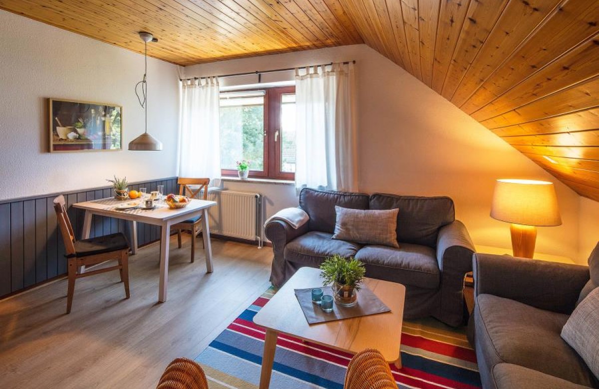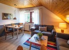Das Appartement ist ca. 32 qm groß und liegt im ersten Stock eines Vier-Familienhauses. Im Wohnzimmer befindet sich eine gemütliche Sitzecke mit Couch, ein Essplatz, die neue Küchenzeile mit einem kleinen 2er-Kochfeld, Kühlschrank, Kaffeemaschine, Wasserkocher, Eierkocher, Toaster sowie ausreichend Geschirr, Töpfe und Bestecke.